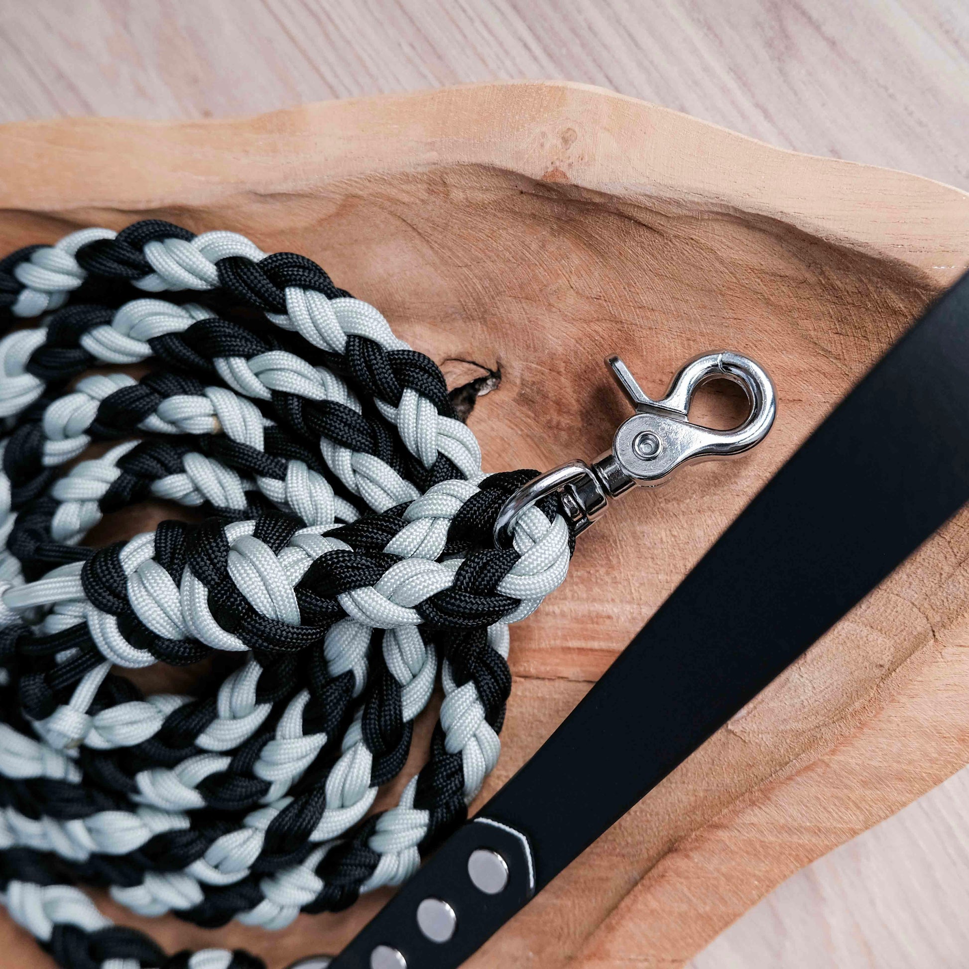 Paracordové vodítko je pletené z padákových lan, která mají nosnost přes 200kg. 💪 Vodítko je vybaveno 63 mm rychlovypouštěcí karabinou s otočným okem, které předchází jeho zamotání.