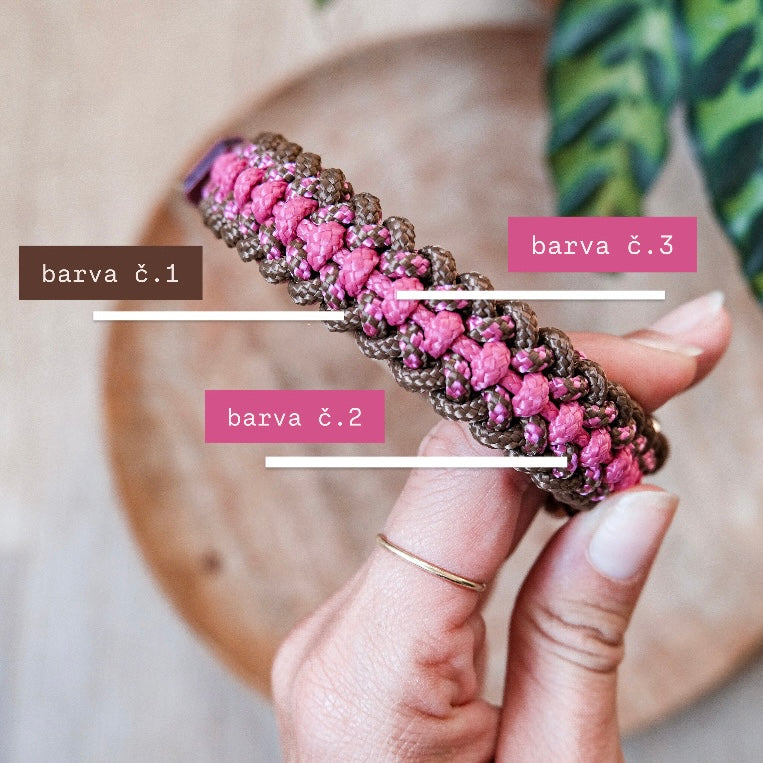 Barvy: V galerii produktu najdeš vzorky barevných šňůr, ze kterých si prosím vyber 3 barvy. Zároveň tam najdeš fotku, která ukazuje umístění barev na obojku. Do poznámek v košíku nám potom napiš čísla vybraných odstínů a jejich volbu pro barvu č.1, 2 & 3.